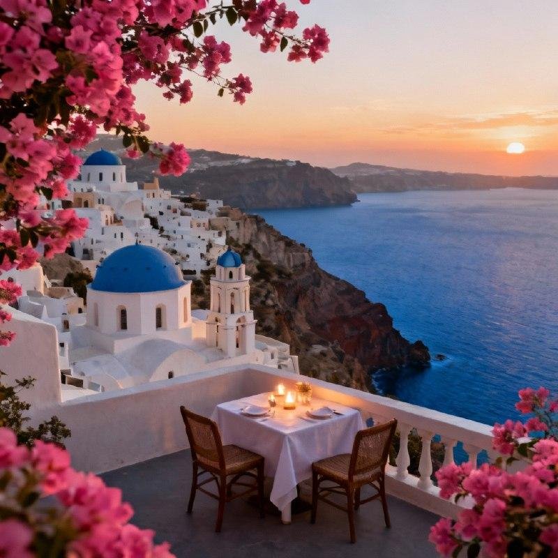 - الجمال المعماري: تكتسب البيوت البيضاء في جزيرة سانتوريني بريقاً ذهبياً وقت الغروب، مما يجعلها اللحظة الأكثر تصويراً في العالم.